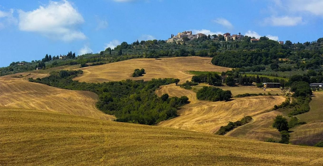 Leaving the hotel, you turn to the right towards Arbia and then to the left towards Asciano. Asciano, an ancient possession of the counts della Scialenga, still preserves its centre where each second Sunday of the month the Mercatino delle Crete (typical and organic products, terracotta…) is held. From Asciano you can easily reach Rapolano, a well-known thermal resort, and Serre di Rapolano where the Cappella dei Cacciaconti, princes of Serre, in the local church is worth a visit. In the village there is also a Grancia del Santa Maria della Scala, an ancient barn now used as a museum. Going back to Arbia, just outside Asciano, you turn to the left to follow the spectacular road leading to the Abbey of Monte Oliveto Maggiore. It was founded in 1313 by Bernardo Tolomei in the so-called Acona desert. The cloister of the abbey preserves beautiful frescoes by Sodoma representing St Benedict’s life. Turning back towards Asciano, after one kilometre you turn to the right towards S. Giovanni d’Asso. The historical centre on top of a hill is dominated by the Castello where the white truffle fair is held. In the centre there is also S. Giovanni Battista’s church dating from the 14th century.